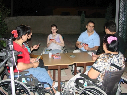 We gaan in een groot winkelcentrum met haar eten. Ze was er nog nooit geweest, want ze komt om de zo juist genoemde actie bijna nooit buiten. Ze genoot zichtbaar van dit onverwachte uitje en later hebben we haar naar Klodi en Majlinda, een ander gehandicapt echtpaar, gebracht. Ook zij zitten in de leiding van dit kamp. ’s Avonds weer een hele fijne avond gehad met de gehandicapten die zichtbaar genoten van alle aandacht en tijd die ze kregen. Ook Shpresa genoot, maar moet voor morgen opnieuw toestemming van haar broer krijgen om te komen naar het kamp. Al met al een vermoeiende maar fijne dag.